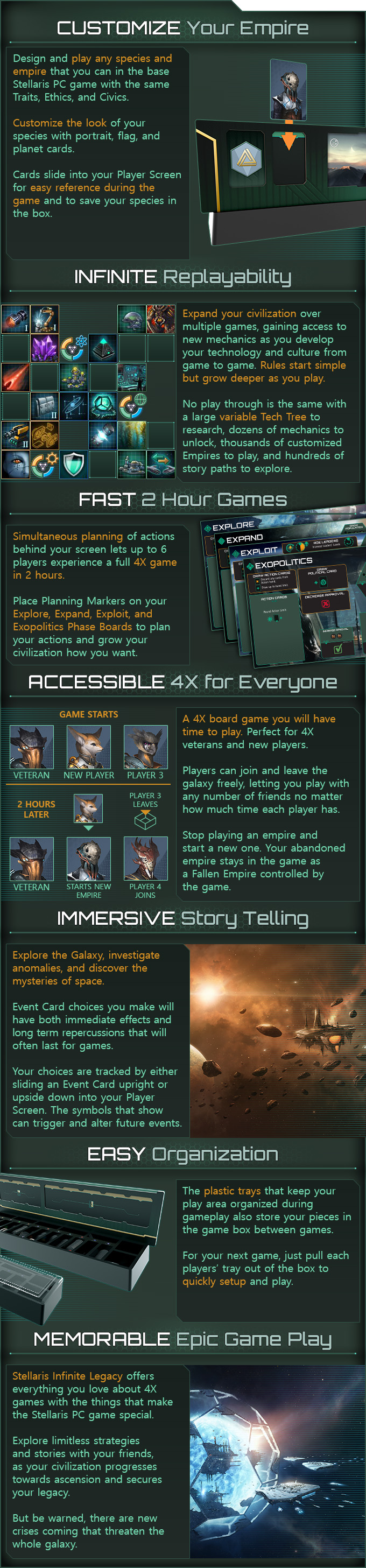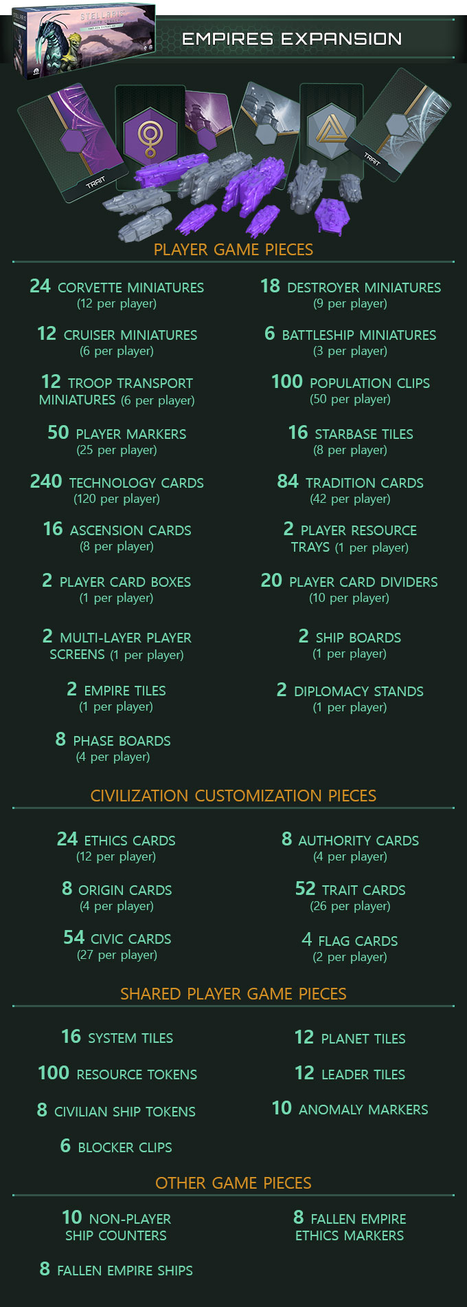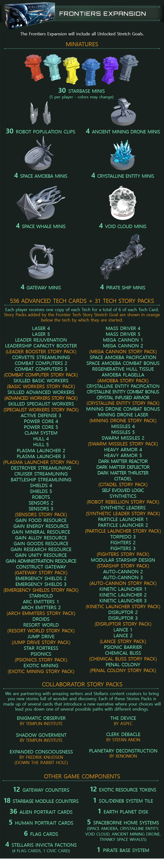Discover everything the universe of Stellaris Infinite Legacy has to offer with 2 to 6 players. This pledge level includes all unlocked Stretch Goals (shipped in the Frontiers Expansion box) and the Empires Expansion that adds the 5th and 6th players.